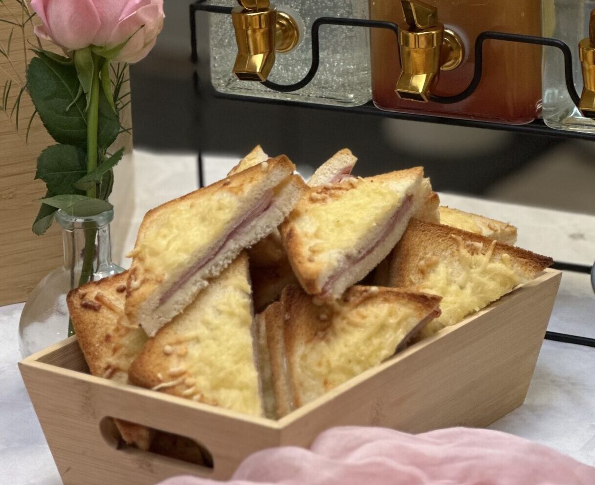 Pain de mie, fromage fondu et jambon cuit (version halal sur demande).