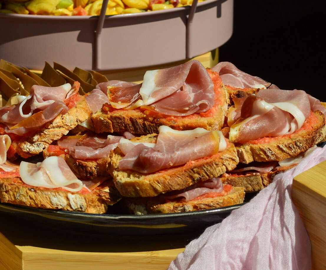 Pain blanc toasté, huile d’olive, ail, tomate et jambon Serrano.